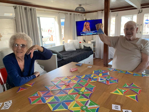 Players take turns placing colour matching triangle cards